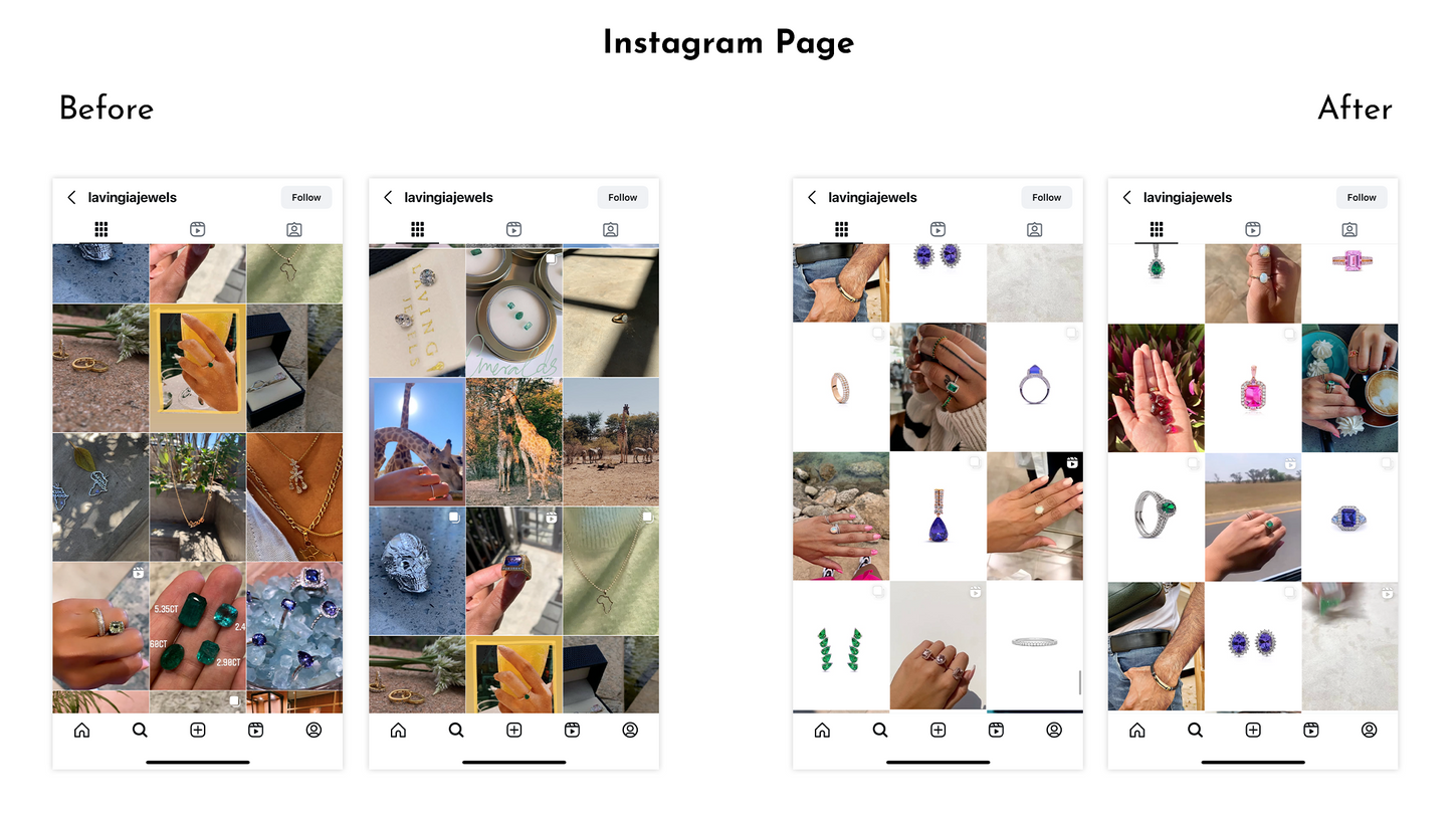 Lavingia’s Instagram felt underdeveloped. Product photos were inconsistent in quality. Lighting and styling didn’t match the brand’s elegance. Captions were minimal and lacked strategy. In person, the brand was luxury and heritage-rich. Online, it fell flat.
